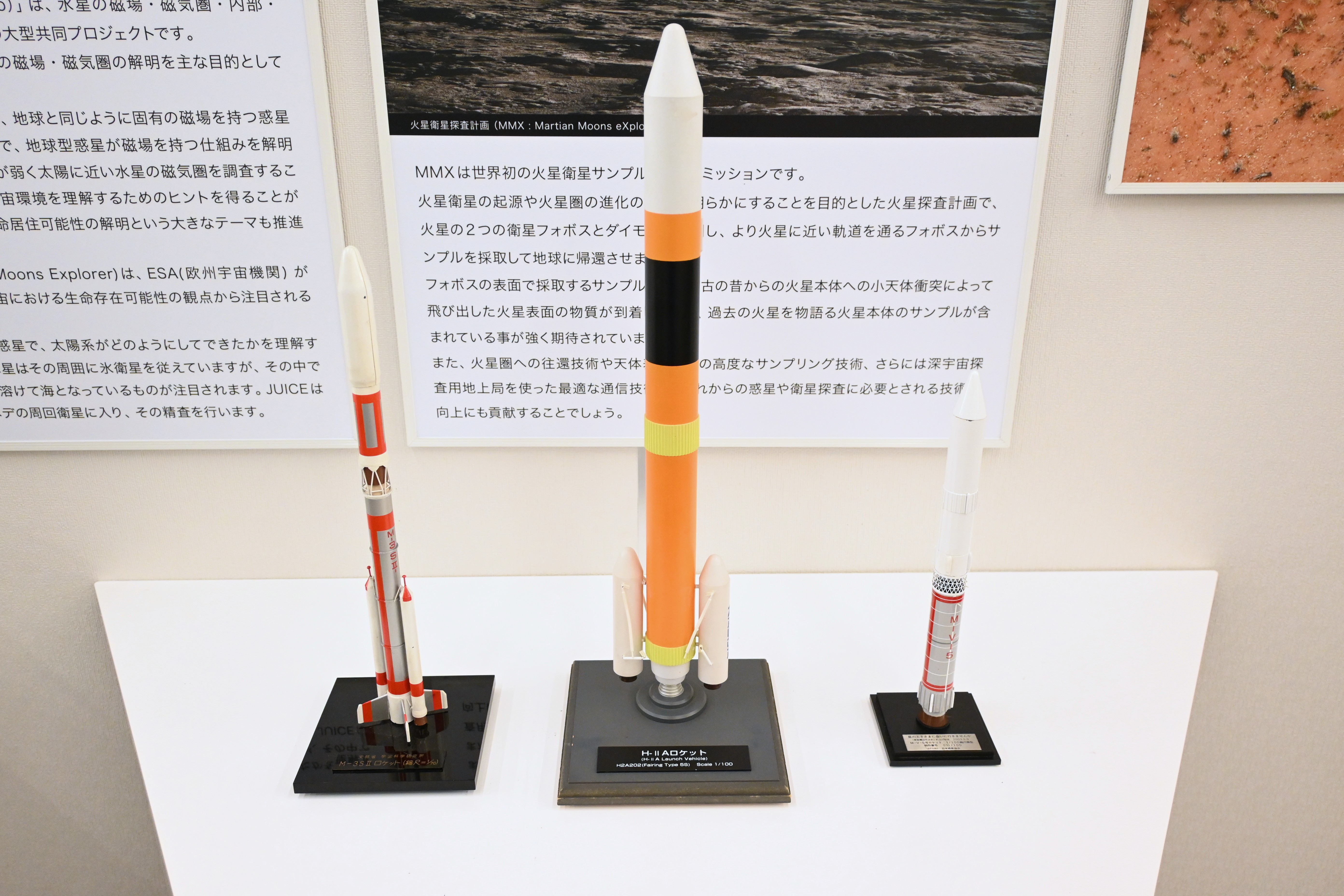M-3S2 ロケット模型(縮尺1/70)、H-2A ロケット模型(縮尺1/100)、M-V-5 ロケット模型(縮尺1/100)