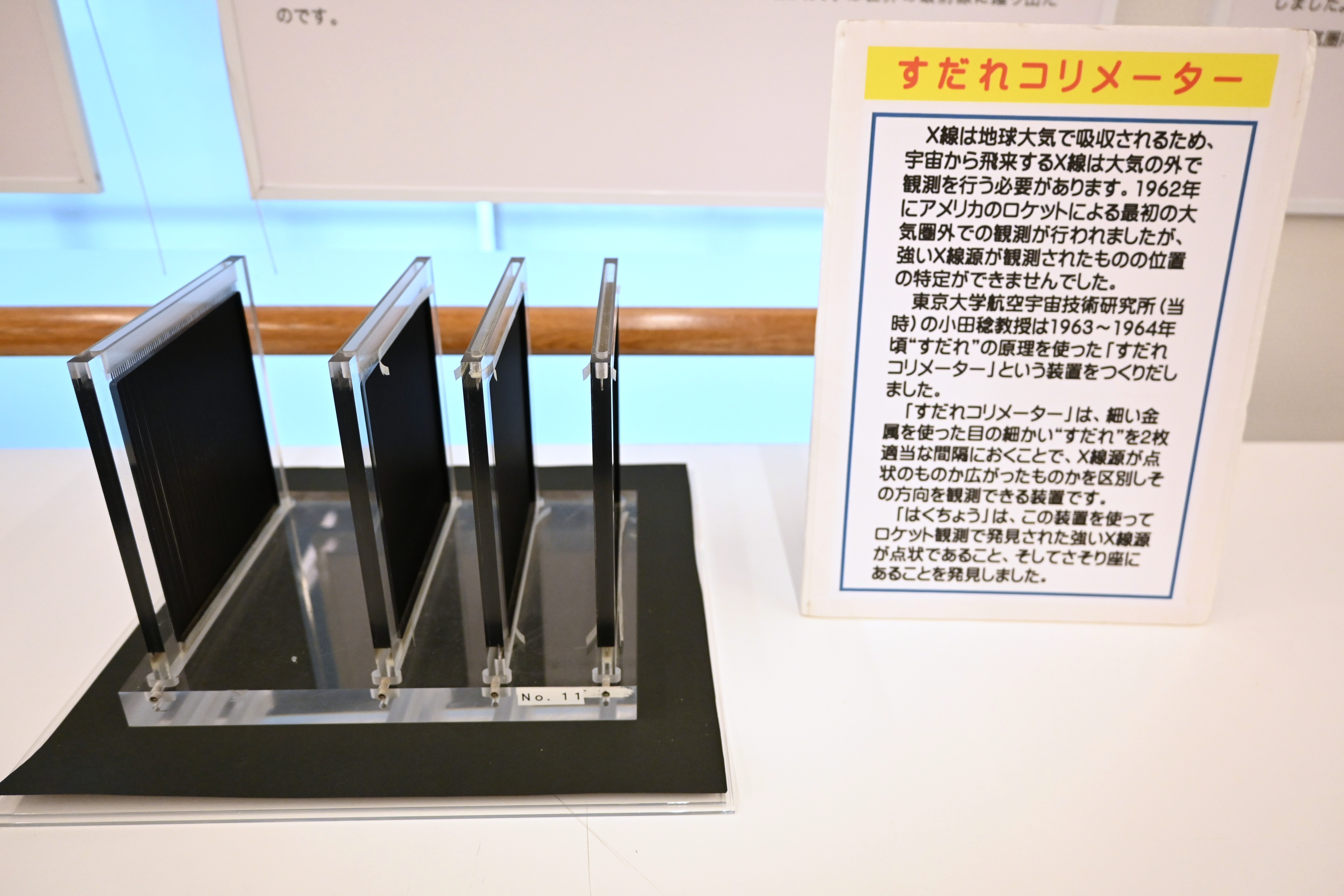 「すだれコリメーター」は、細い金属を使った目の細かい“すだれ”を2枚適当な間隔におくことで、X線源が点状のものか広がったものかを区別し、その方向を観測できる装置です。1963~1964年頃、東京大学航空宇宙技術研究所(当時)の小田稔教授が開発し、ロケットによる観測からX線天体の位置測定を行いました。