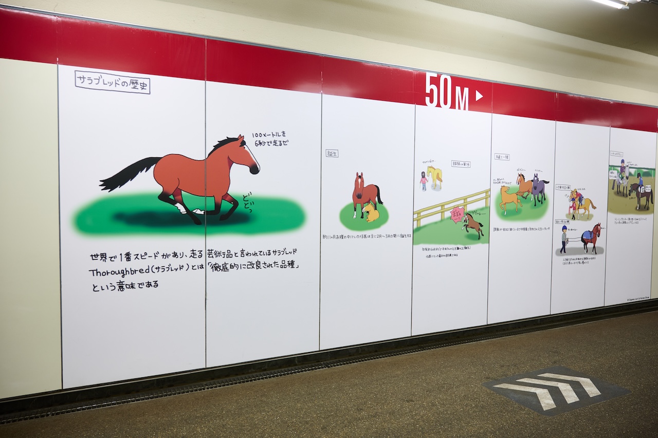 キッズガーデンへ向かう途中の連絡通路には、馬の生態やトリビアが描かれています。「へぇ〜!」が止まらない小ネタが満載で、移動しているだけなのに楽しめる仕掛けが魅力です。