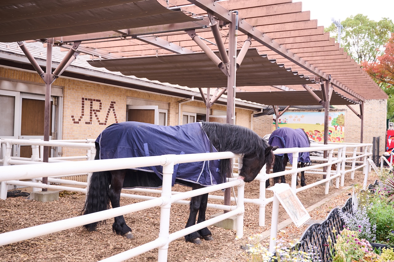 放牧シーンとは異なり、東京競馬場では乗馬センターでさまざまな品種の馬を見学できます。開門から16時まで自由に立ち寄れるため、気軽に馬の魅力を楽しめるスポットです。午前中は比較的空いていて、のんびりゆっくりと馬たちを眺めるのに絶好の時間帯。それぞれの馬の個性や表情がじっくり観察できます。