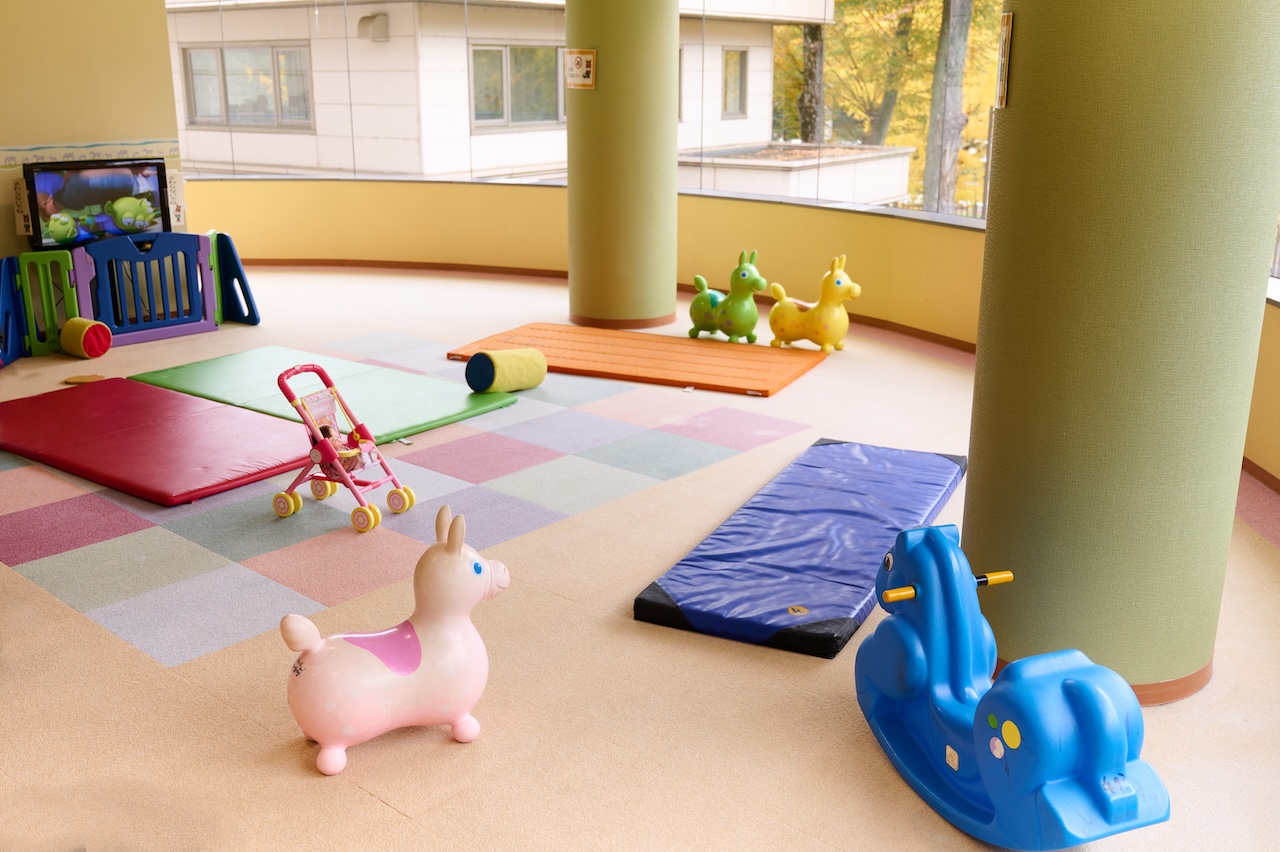 フジビュースタンド2階のベビー・チャイルドルームはファストフードコート横にあり、利用時間は 9時〜16時。入室時はベビーカーをたたみ、靴を脱いで入るスタイルで、とても衛生的です。床には柔らかいマットが敷かれていて、ハイハイ期の赤ちゃんでも安心。授乳室やおむつ替えスペースに加え、調乳ポットと洗面台も備えているので、ミルク作りにも困りません。スタッフ常駐で初めての赤ちゃん連れでも安心して利用できます。