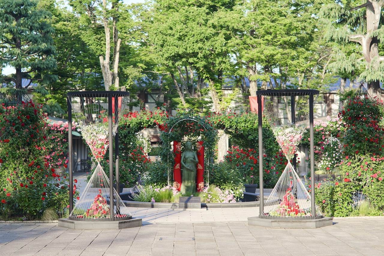 東京競馬場のローズガーデンは、競馬開催時のみ一般開放される特別なエリア。噴水と緑に囲まれ、300種以上のバラが咲き誇る姿はまさに圧巻。5月の見頃には甘い香りがふわりと漂います。