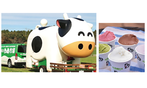 成田ゆめ牧場(千葉県)のイメージキャラクター「ゆめこちゃん」をモチーフにした、牛の形をした愛らしい牽引型キッチンカーです。