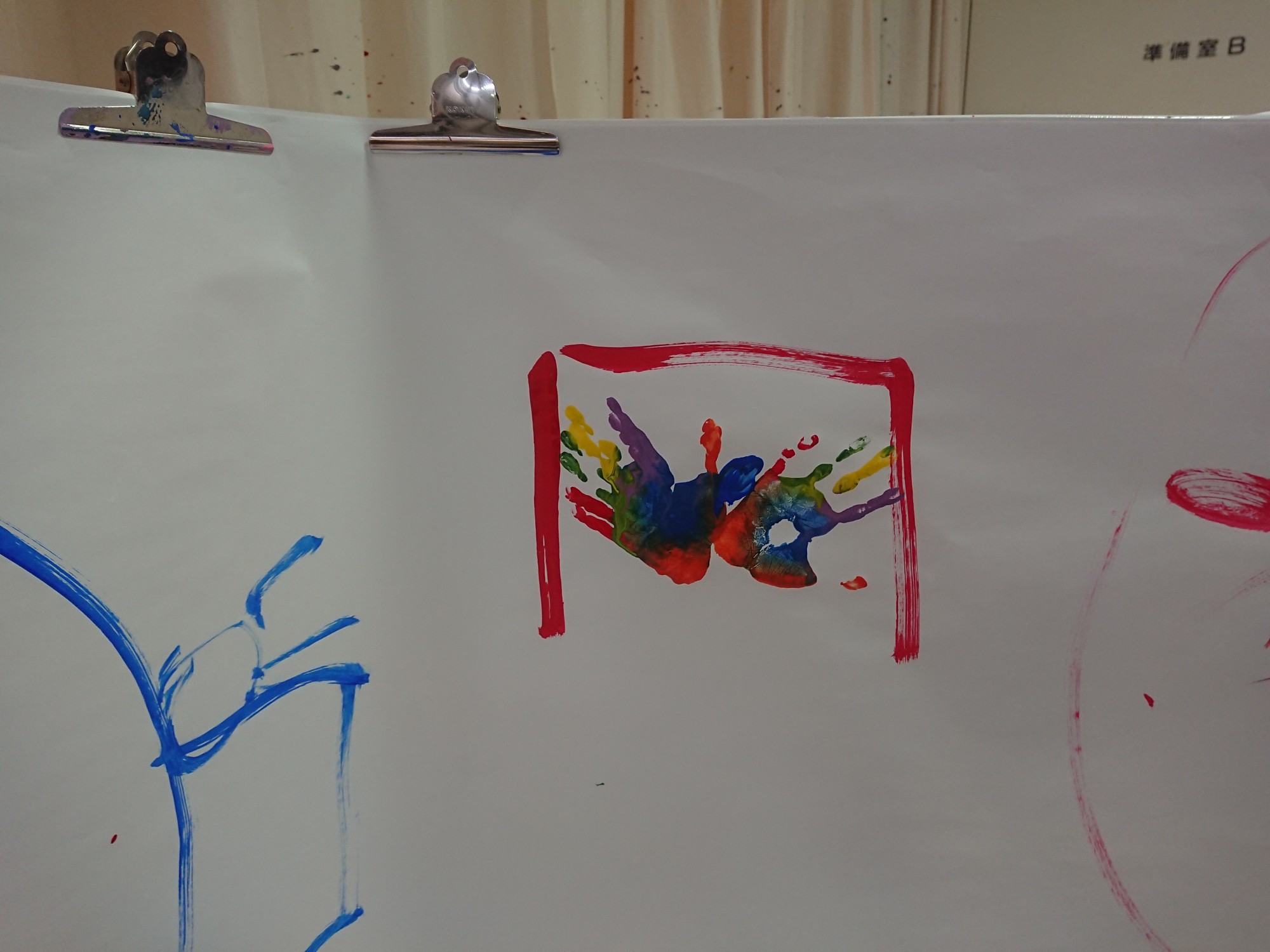 絵の具でダイナミックにお絵かき!って家でやるには色々な道具と、勇気(これが一番重い)が要りますよね。ここではたくさんの色の絵の具があり、普段は絶対に叱られる壁や床にお絵描きができます。