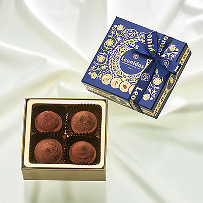 期間限定の「マノンアンタンスノアール」は、プラリネのレイヤーとダークチョコレートムースのフィリングをダークチョコレートで包み、トッピングにもダークチョコレートチップを飾ったチョコレートラバーに贈る一品です。レオニダスを代表する「マノンカフェ」を含む4種類のプラリネをお楽しみいただけるアソートです。