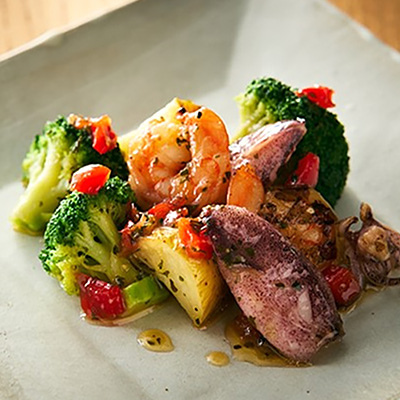 グリルした魚介に、バジルやタイム、パセリを効かせた香草オイルをかけて仕上げた、ごちそう感あふれる一品です。