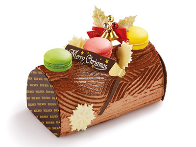 チョコレートクリームとヘーゼルナッツとアーモンドのジャンドゥヤをサンドしました。カラフルなマカロンが楽しい薪の形のクリスマスケーキです。