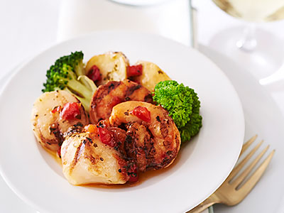 北海道産帆立と海老の食感を活かしたごちそうグリルです。バジル・タイム・パセリ・オリーブオイルで作った香草オイルで、魚介の旨みを引き立てました。