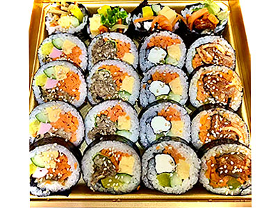野菜・牛カルビ・クリームチーズ・豚サムギョプサルの4種のキンパが味わえるセットです。