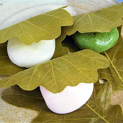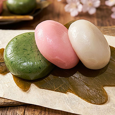 端午の節句には欠かせない、やわらかなお餅であんを包む「かしわ餅」はこしあん・つぶしあん (草もち)・みそあんの3種をご用意しております。