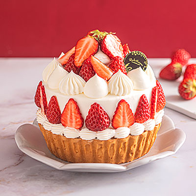カスタードタルトに、紅ほっぺとホイップクリームをふわふわのスポンジで重ね合わせました。コクのある甘みと酸味のバランスがいい紅ほっぺを飾った華やかなタルトです。