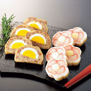 〈小出仙〉一番のお奨め品、玉子を牛肉を混ぜたかまぼこで包んだ「牛肉半月」と、一番人気のチーズをかにかまぼこでくるんだ「かに梅花」。