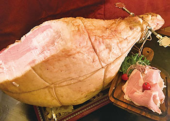 放牧豚”どろぶた”を使用したももハムをその場でカットしてご提供いたします。切りたてならではの肉質の柔らかさと肉汁ジューシーな旨みが味わえます。