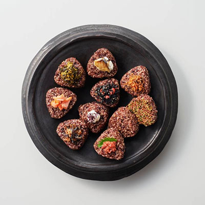 鹿児島県産の玄米と紫黒米を黄金比でブレンドし、独自製法で炊き上げ、10種類の具材でおむすびにしました