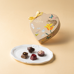 ティーパーティを彩る紅茶やカップケーキなどをイメージした限定チョコレートを、物語のシンボルのトランプやティーセット、いたずら好きなチェシャ猫を描いたハート形のパッケージに詰め合わせました。