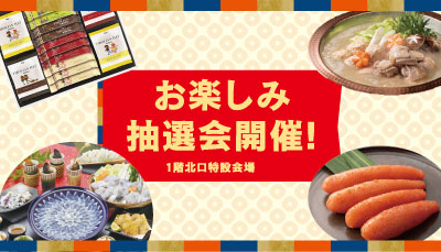 期間中「福岡よかもん・うまかもん市」各会場で3,000円〈税込・合算可〉お買い上げごとに、抽選で60名様に福岡の特産品が当たる抽選会にご参加いただけます。