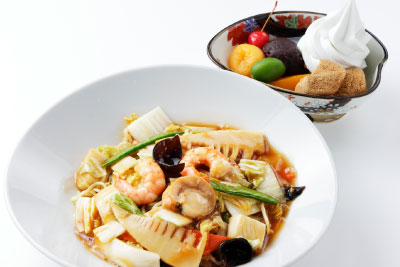 具だくさんの五目あんかけ焼きそばと人気のクリームあんみつのお得なセットです。お食事もスイーツも楽しみたい方におすすめです。ぜひご堪能ください。