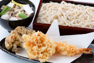 海老天、百合根天、舞茸天、そばがき汁、少なめせいろそば