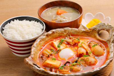 ピリ辛の味噌チゲにはぷりぷりの牡蠣が3つ入り。温玉付きで、まろやかな味わいにも変えてお楽しみいただける冬にぴったりのお盆です。ご飯、野菜味噌汁、漬物がセットでボリューム満点です。
