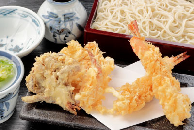 海老天2本、百合根天、舞茸天、カニ爪天、せいろそば又はかけそば
