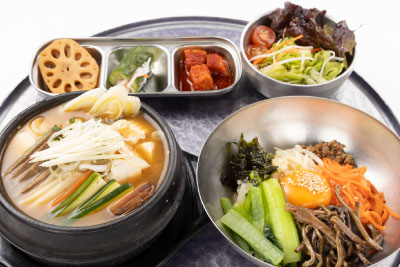 牛肉、野菜、豆腐、干しダラを味噌で煮込んだ韓国定番のチゲ料理です。旨みたっぷり熱々の、この冬おすすめのセットメニューです。