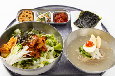 野菜たっぷり、彩り良いサラダ風ビビンバとミニ冷麺のあっさりと味わえるセットです。