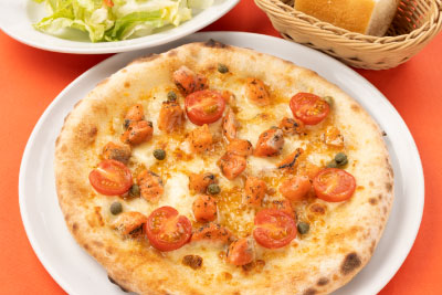 ディル風味サーモンとドライトマトのピッツァ、グリーンサラダ、北海道産小麦の自家製パン