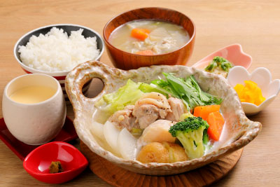 鶏肉と野菜の旨味が溶け込んだ優しい味わいのポトフには柚子胡椒をお好みで。ご飯、味噌汁、小鉢、漬物がセットでボリューム満点のお盆です。