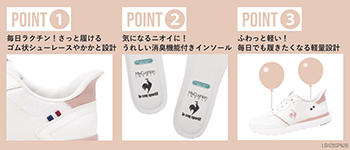シューレース部分にはワンポイントのパーツを取り入れており、スニーカーながら大人の女性でも履きやすいエレガントなデザインに仕上げています。