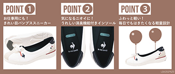 大人な女性に向けた、きれい目パンプススタイルの軽量スニーカーです。パンプスのような浅ぐりのデザインながら、包み込むような足入れ感とコンフォート性を追求しました。
