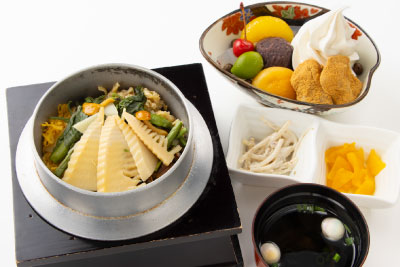 旬の山菜とたけのこが入った釜めしと人気のクリームあんみつをセットにしました。お食事もスイーツも楽しみたい方におすすめのセットです。ぜひご堪能ください。