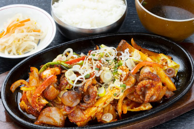 チュクミ(イイダコ)をニンニクと唐辛子で香り良く炒め、コチュジャンベースのタレでたっぷりの野菜とからめた鉄板メニューです。