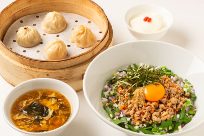 醤油をベースにピリ辛に仕上げた具材たっぷりの汁無しまぜそばと、〈REAL台北〉自慢の小籠包は贅沢に4種付きです。どうぞご賞味ください。