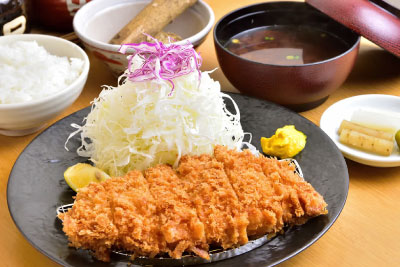 低温で35日間熟成させた豚肩ロースを、うま味と柔らかさを最大限に引き出した良質な肉を最低2㎝という厚さに切り分け、手作りの粗びき生パン粉で包んだ〈玉藤〉イチオシの一品。衣はサクッと肉は厚みがあるのに柔らかくてジューシーに仕上がっております。職人が一枚一枚丁寧に揚げた絶品とんかつをぜひご賞味ください。選べる3種のごはん、選べる3種の味噌汁と一緒にお楽しみください。