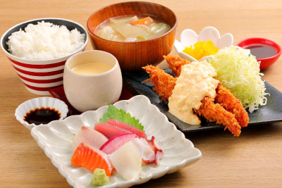海老フライ、刺身(マグロ・サーモン・ハマチ・たこ・カレイ)、茶碗蒸し、ご飯、野菜味噌汁、漬物