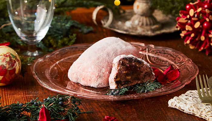 自家製セミドライいちご(栃木県産苺)、クランベリー、いちじくを苺のリキュールに漬け、マジパン、3種のナッツを生地に配合。中心に自家製パートドフリュイを包み込みました。