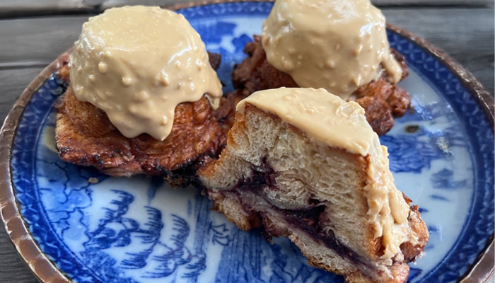 アメリカのPBJサンドをイメージしたクロッカン。 ベリージャムからマーガオという台湾スパイスをほのかに感じます。ぜひコーヒーと一緒にお楽しみください。