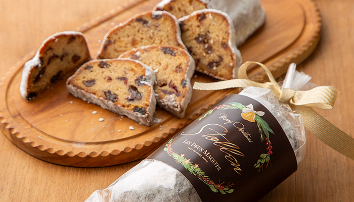 洋酒に漬け込んだ2種類のレーズン、クランベリー、オレンジピールと、いちじく、クルミ、オリジナルスパイスのシュトレンです。