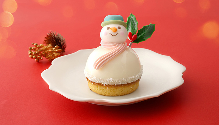 さわやかなオレンジのクリームを包んだレアチーズケーキのスノーマン。アーモンドケーキにのせて。