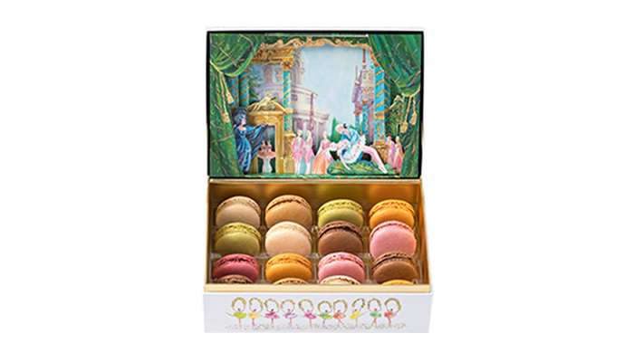 パリ国立オペラとのコラボレーションによる、フランス人水彩画家のミシェル・シャリエが描いたマカロンボックス。エトワール・ダンサーたちの優雅さと、ルドルフ・ヌレエフの華麗な演出にインスピレーションを得たこのボックスは、まるでミニチュアの舞台装置のようにその世界が広がります。