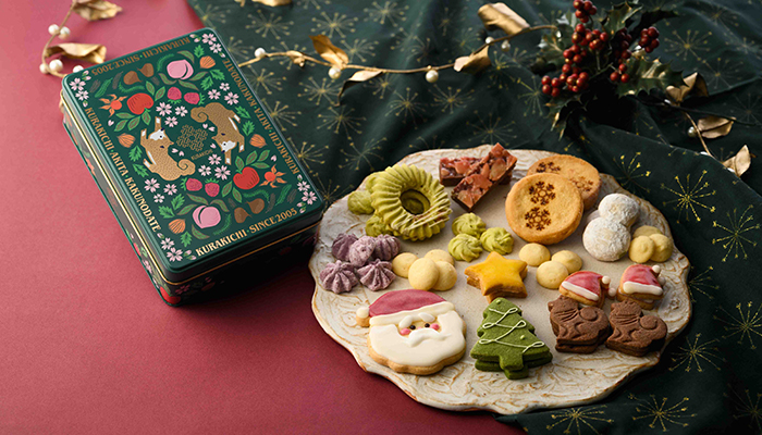 秋田県産のフランボワーズやほおずき、善兵衛栗を使用したKURAKICHIあきたフルーツクッキー缶。雪国秋田の雪だるまをイメージしたスノーボールや秋田犬が赤い帽子を被りサンタを待ちわびている様子をイメージした見た目にもワクワクするクッキー缶です。