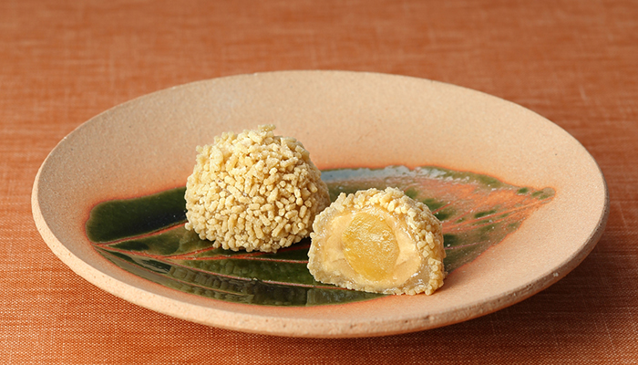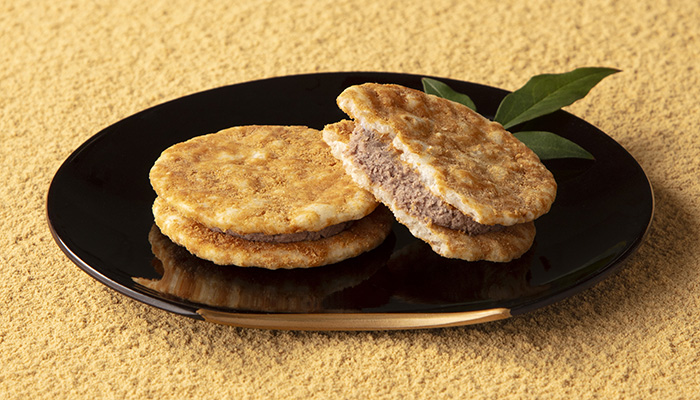 おはぎに見立てたおせんべい。お米パフが入った薄焼せんべいにきな粉をまぶし小豆クリームを挟みました。甘じょっぱい味わいに仕上げてます。