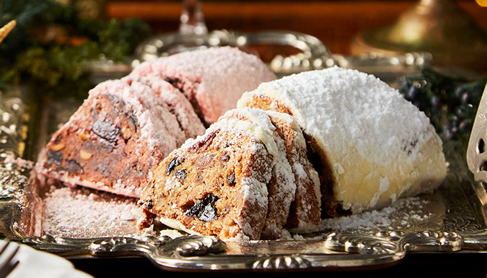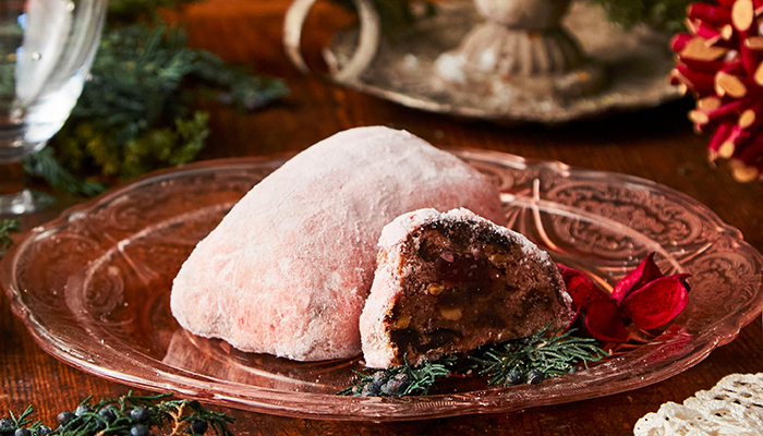 自家製セミドライいちご(栃木県産苺)、クランベリー、いちじくを苺のリキュールに漬け、マジパン、3種のナッツを生地に配合。中心に自家製パートドフリュイを包み込みました。