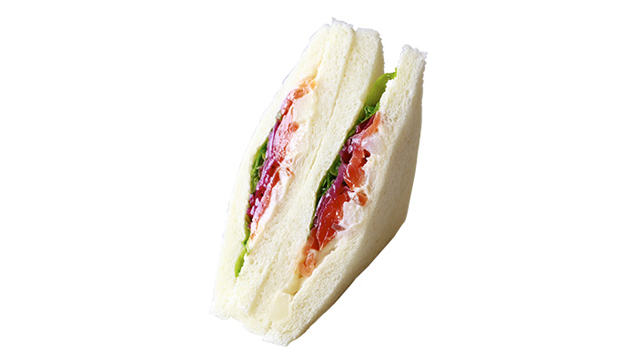 とろけるようなマイルド食感のスモークサーモンをたっぷりサンド!赤紫のビーツラペがアクセントになっています。