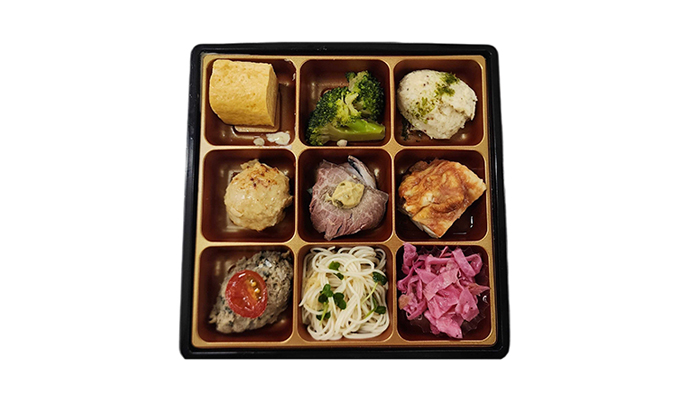 「えさきのおべんとう」人気のお惣菜を9種類贅沢に盛り付けました。野菜だけでなく大山鶏もお楽しみいただけるお弁当です。