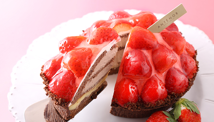 カスタードを焼き込んだチョコタルトに、甘酸っぱい紅ほっぺ苺とクリームを重ねました。苺とショコラの香りのハーモニーが絶妙です。