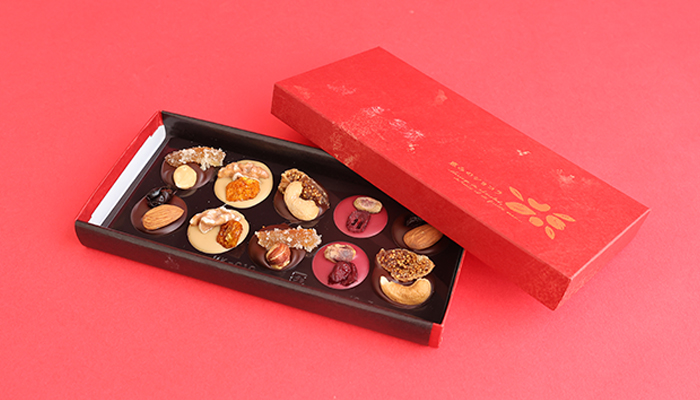 パティシエこだわりの3つのチョコレートとフルーツの組み合わせで5種類のマンディアンを詰め合わせた「恵みのショコラ」です。