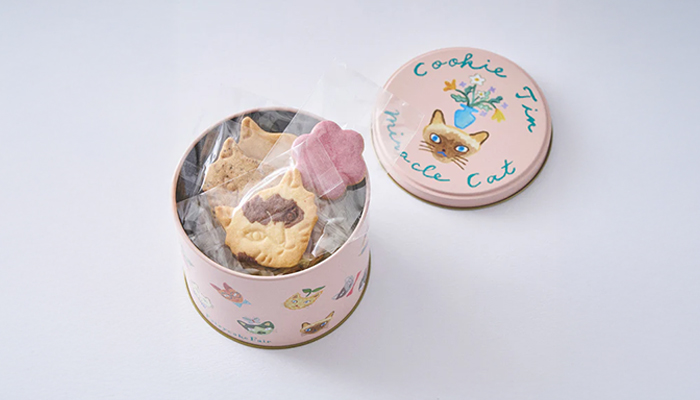 一匹ずつ模様が違う猫たちが、可愛い缶にぎっしり!心躍る柔らかなピンクを纏った限定デザインが登場。発酵バターやカカオ、アールグレイを使って焼き上げたクッキーをアソートし、甘酸っぱいラズベリーのアイシングで彩ったお花型クッキーを組み合わせました。