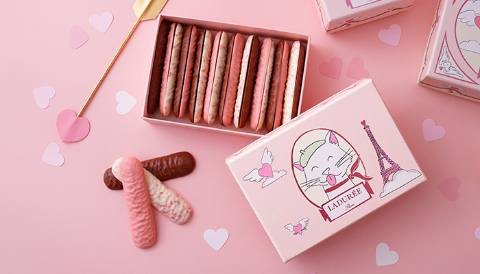 フランス人アーティストのギョーム・サルダンの遊び心あふれるロマンティックなパリと、ベレー帽をかぶった猫を描いたボックスに、猫の下を模った苺フレーバーのホワイトチョコレート、苺フリーズドライを散りばめたミルクチョコレートとバニラフレーバーのホワイトチョコレートの3種の詰め合わせ。
