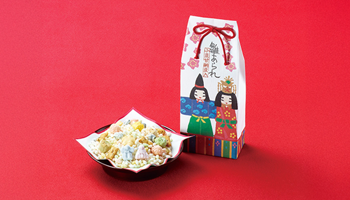 国産もち米使用のサクサクあられ種やおひな様をかたどった雛打菓子など8種のお菓子と北海道産小豆の甘納豆が入ったおいしく楽しいひなあられです。
